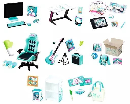 Build your own miniature Hatsune Miku-themed room! This set from Re-Ment has the perfect lineup of items for Hatsune Miku lovers, including a Miku chair, guitar, computer and more merch! Which assortment of Miku items will you get in your blind box? It's a surprise!