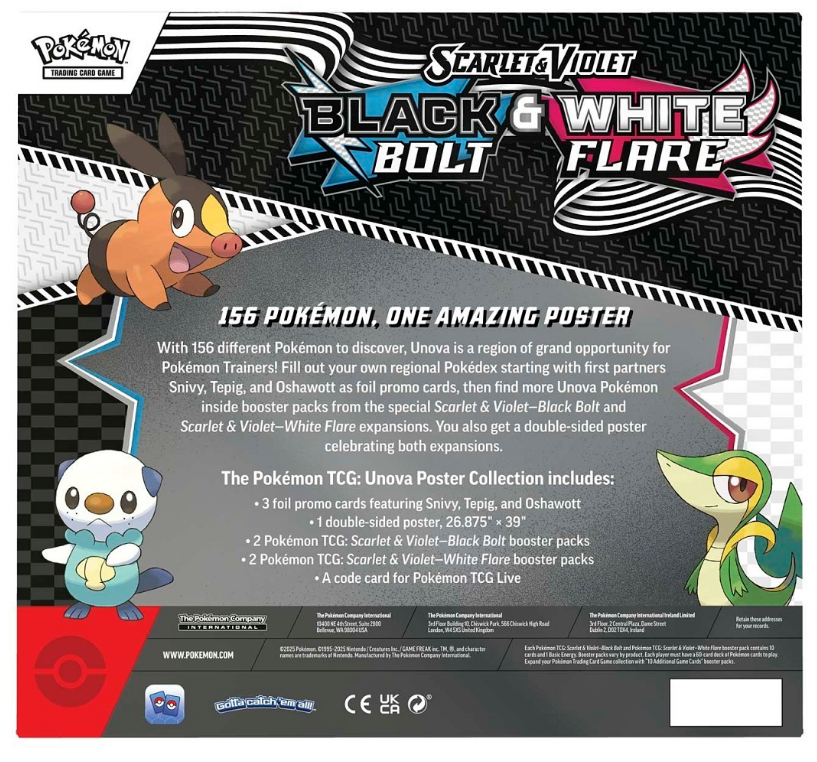 Start your adventure with the beloved first partner Pokémon Snivy, Tepig, and Oshawott as exclusive foil promo cards. Expand your collection even further with booster packs from the exciting Scarlet & Violet—Black Bolt and Scarlet & Violet—White Flare expansions. Plus, decorate your space with a large double-sided poster featuring artwork from both expansions.