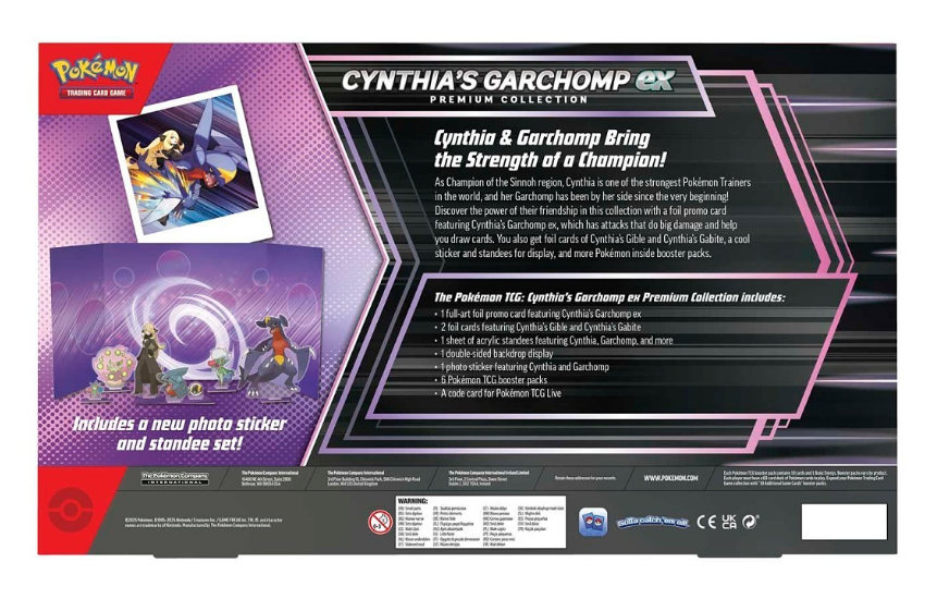 Featuring Cynthia’s Garchomp ex, a full-art foil promo card with powerful attacks and card-drawing abilities, this set also includes foil cards of Cynthia’s Gible and Cynthia’s Gabite, fun acrylic standees, a double-sided backdrop, and a collectible sticker. Plus, enjoy six Pokémon TCG booster packs to expand your deck and a code card for Pokémon TCG Live to continue your battles online.